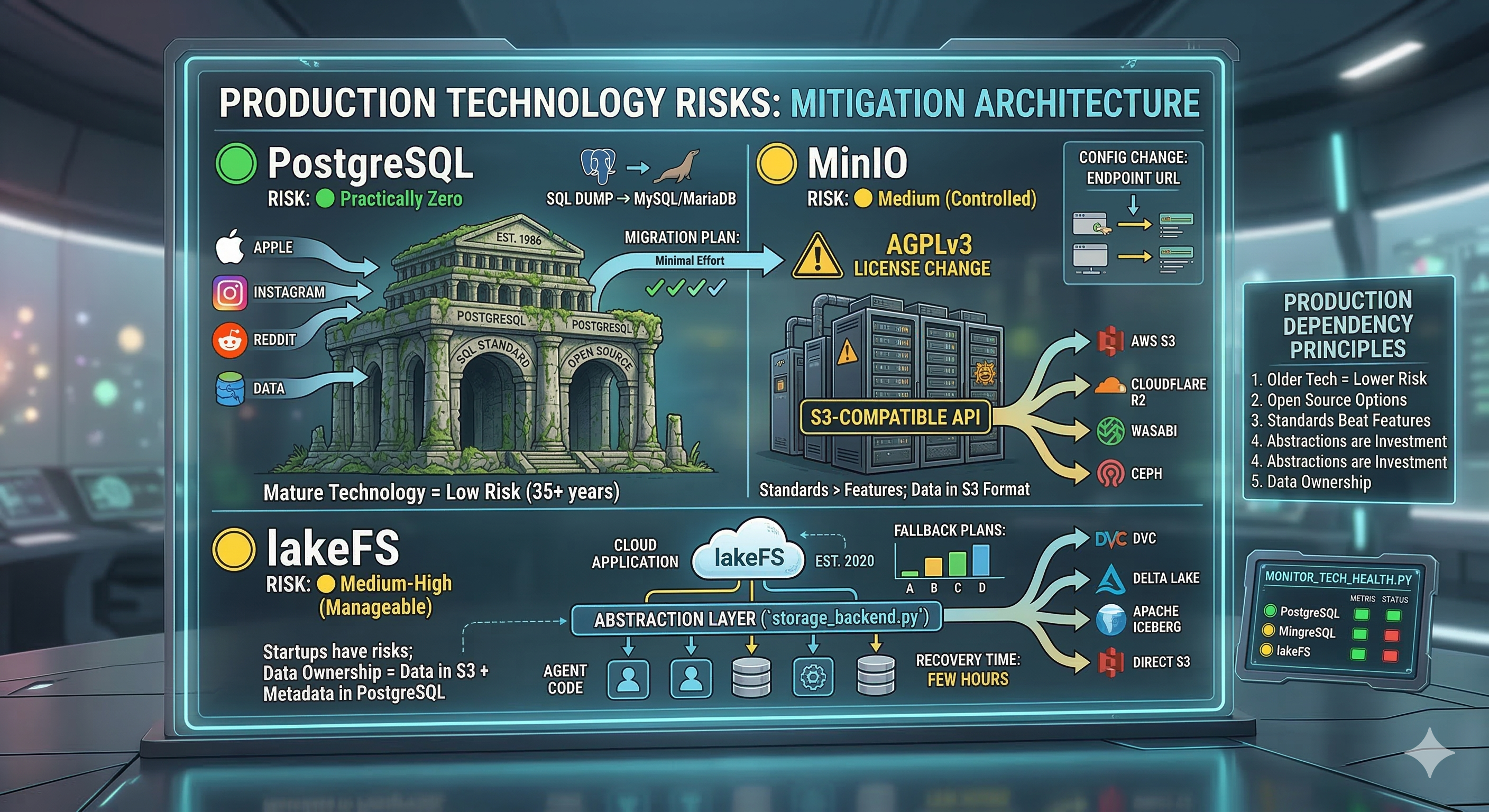 My system has three key dependencies: PostgreSQL, MinIO, lakeFS. They look similar (databases, storage, versioning), but their risks are completely different.